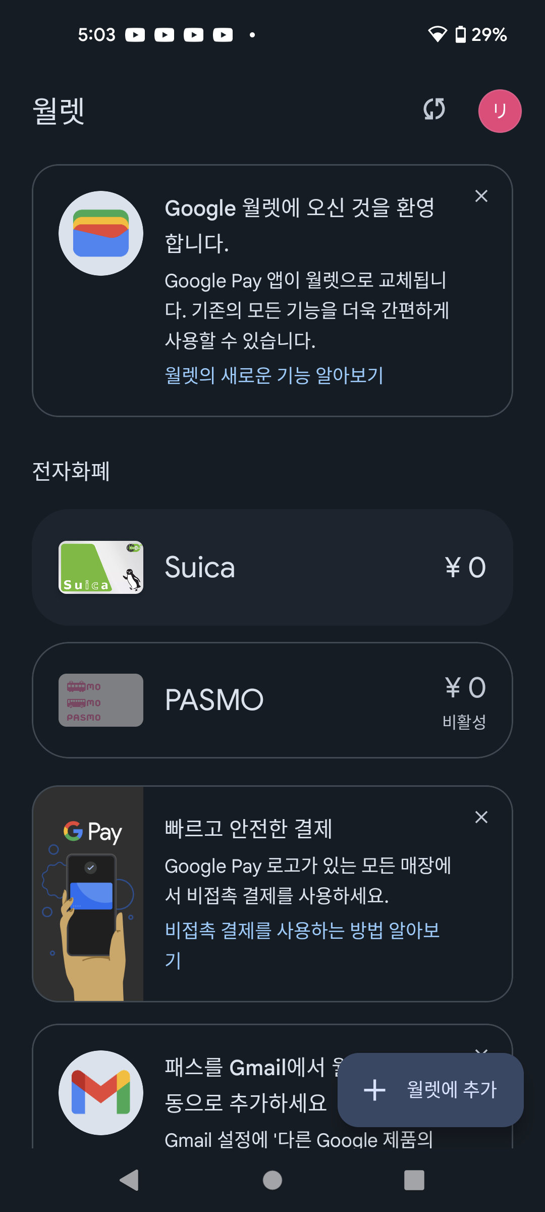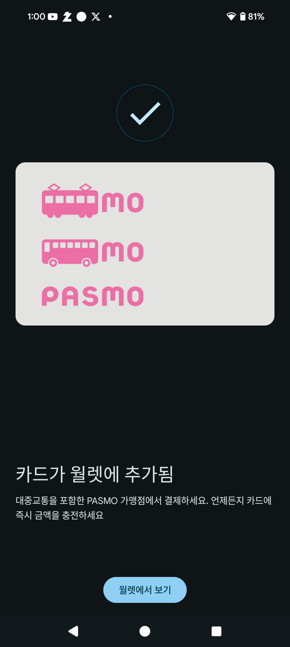 그래도 PASMO를 쓰고싶다면, 해결책은 다른 구글계정을 폰에 추가해 그것으로 구글페이에 로그인하면 무기명 PASMO를 받을 수 있다. 1년 전 경에 한국 구글 계정에도 Google 월렛 앱이 풀려서 그런가 의외로 한국 계정으로 로그인 해도 맨 위에서 말한 관련 앱만 깔려 있으면 별 무리 없이 일본의 전자화폐를 발급받을 수 있다.